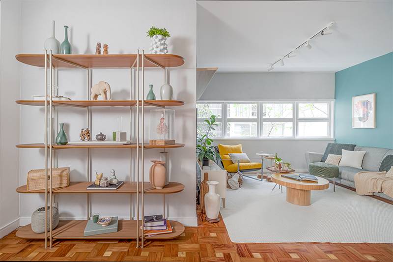 Entre os poucos itens novos escolhidos para compor o espaço, a Poltrona Emmet, do Studio Massimo, ganhou destaque na sala, somando-se ao acervo afetivo dos moradores e reforçando a mistura entre peças de design e objetos com história. Para dar mais personalidade aos ambientes, as paredes receberam cores da Suvinil, criando um pano de fundo acolhedor e vibrante para os móveis, quadros e livros que já faziam parte da vida do casal.