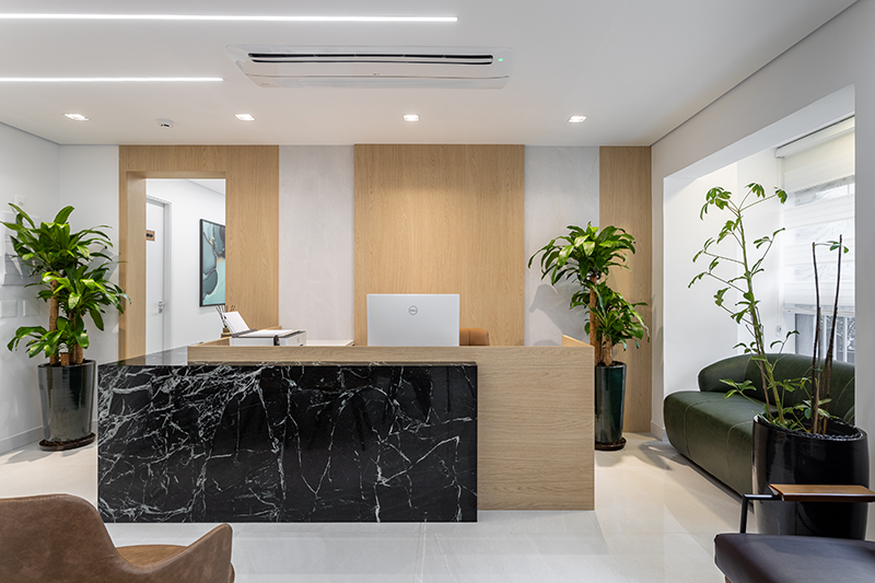 Logo na recepção, o projeto revela sua identidade. A bancada em Mármore Verde Alpi é o grande destaque e imprime personalidade ao ambiente. O material nobre dialoga com a marcenaria em madeira clara e com os painéis que revestem as paredes e o acesso às salas, criando uma atmosfera acolhedora e sofisticada na medida certa.