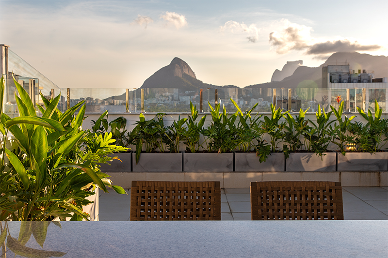 Em uma cobertura de 40m², o projeto de paisagismo assinado pelo Studio Julio Sousa Paisagismo transforma a relação entre arquitetura e natureza em algo contínuo e fluido. A área externa, com vista privilegiada da cidade, foi pensada para valorizar esse horizonte: vasos cimentícios e móveis em tons pastel compõem a base neutra que recebe a vegetação com protagonismo. “Nas jardineiras, usamos plantas que chegam até a altura do guarda-corpo. Assim, conseguimos contornar a cobertura com verde, mas sem perder a abertura para o olhar”, explica Júlio Sousa.