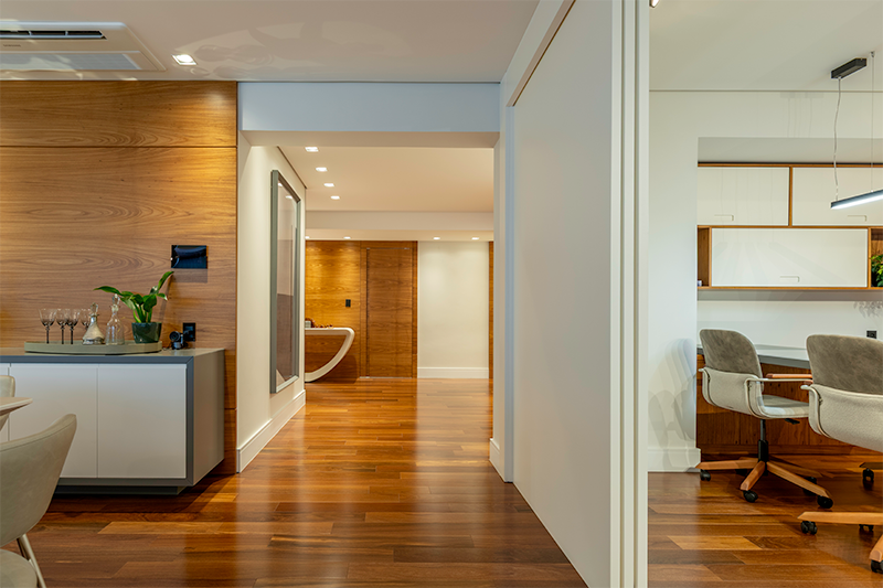 As cores predominantes — branco, cinza e madeira — reforçam a integração visual e mantêm a elegância e a atemporalidade desejadas pelos moradores.