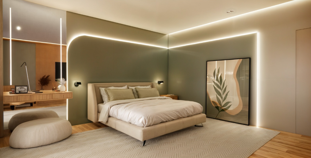 O segredo do conforto na suíte master está no uso de diferentes camadas de luz. A iluminação geral clareia o espaço, e spots e abajures criam pontos de acolhimento. Essa combinação transforma o dormitório em um ambiente relaxante.