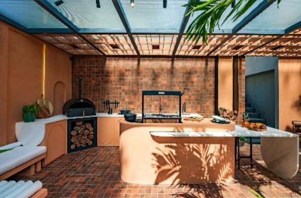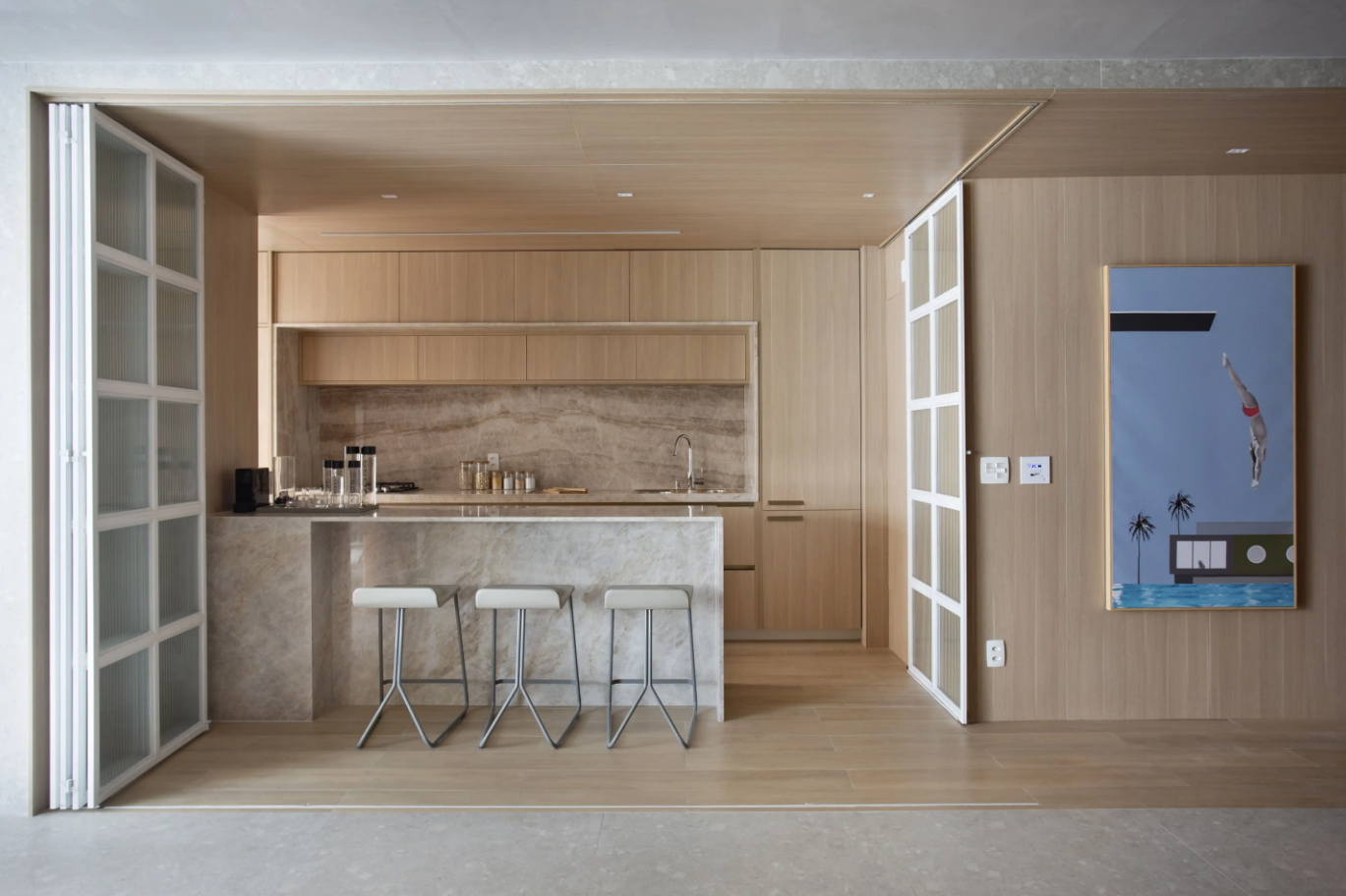 A cozinha ganha rusticidade com armários em madeira clara. Além disso, porcelanato amadeirado ou revestimentos em caramelo ou terracota intensificam esse efeito. Uma dica bacana é investir em utensílios em cobre ou azul petróleo para criar um visual equilibrado e aconchegante.